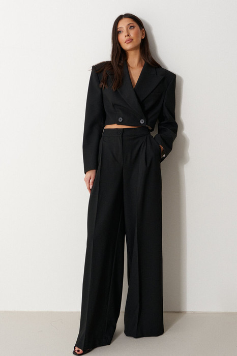 Брюки-палаццо свободного кроя. Выполнены из текстильного полотна черного цвета. В боковых швах карманы с отрезным бочком. Стабильный пояс без шлевок. По передузастежка молния и пуговица. Длина 113 см