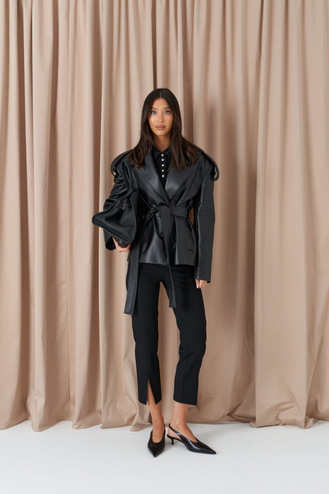 Брюки прилегающего кроя, выполнены из костюмной ткани черног цвета. Характеристики: прилегающий крой, пояс стабильный застежка на молнии с пуговицей, на задней части изделия имитация карманов, передней и задней части брюк застроченные стрелки, в стрелках передней части разрезы. по низу изделия эластичные штрипки. Длина по боковому шву 91,5см.