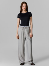 Брюки свободного кроя, выполнены из мягко полотна велюра графитового цвета. Характеристика: свободный корой, пояс на резинке, по низу брюк черное кружево. Длина брюк по боковому шву с учётом кружева 101 см.