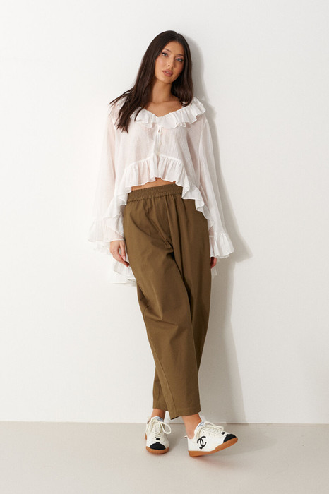 Брюки свободного кроя, зауженные к низу, выполнены из хлопкового полотна коричневого цвета. Характеристика: свободный крой, брючины заужаются к низу, пояс на резинке, имитация гульфика, в боковых швах карманы. Длина по боковому шву 94 см.