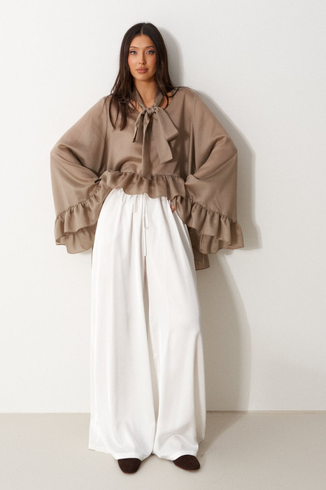 Брюки свободного кроя. Выполнены из мягкой струящейся ткани белого цвета. Пояс на резинке, со шнурочком. В боковых швах карманы. Длина бокового шва (с учётом пояса) 107 см