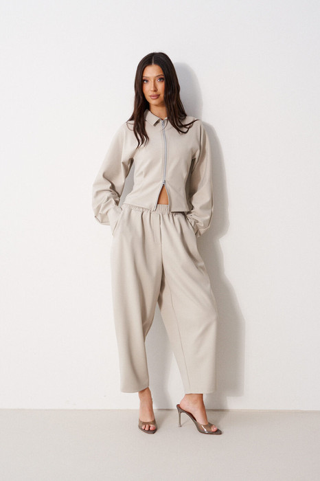 Брюки свободного облегания, зауженные к низу. Выполнены из трикотажного полотна "Водолаз". Характеристика: в боковых швах обработаны карманы с отрезным бочком. Пояс притачной, на резинке, с отделочными строчками. Длина по боковому шву 93 см.