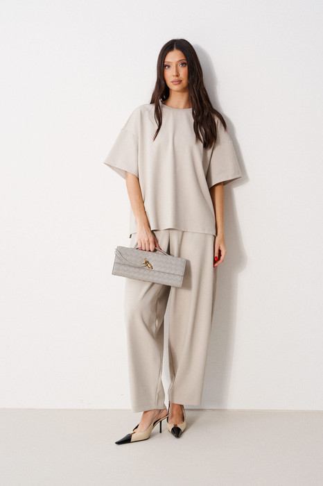 Брюки длинные. Широкие по верхней части и зауженные к низу. Выполнены из трикотажного полотна "Водолаз". Характеристика:По передним и задним половинам талиевые вытачки. По задним половинам накладные фигурные карманы.Верх на резинке. Длина по боковому шву 104 см.