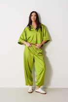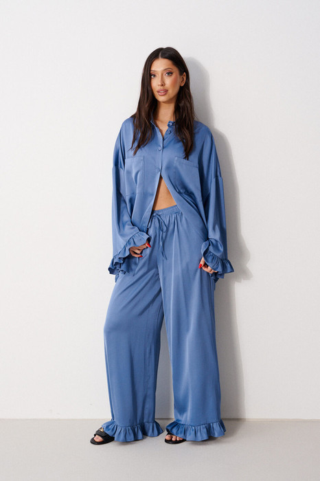 Брюки прямого свободного кроя, выполнены из струящейся ткани. Пояс брюк на резинке с кулиской, в боковых швах карманы, по низу изделия нашит волан. Длина брюк 106 см.