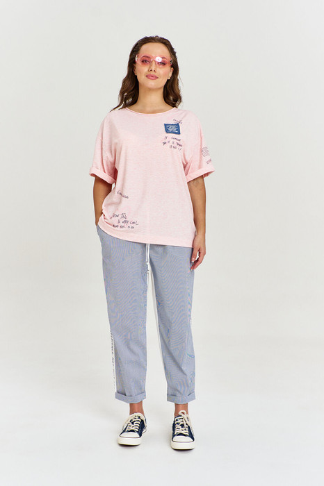 Брюки, силуэтной формы "бананы", выполнены из двух видов материала: задняя часть из хлопковой ткани цвета экрю, передняя из ткани в мелкую полоску. В изделии четыре функциональных кармана. Пояс широкий, на резинке, сс кулисой и шнуром. По бокам брюк шрифтовой авторский принт, эффектно сочетающий между собой два вида ткани.