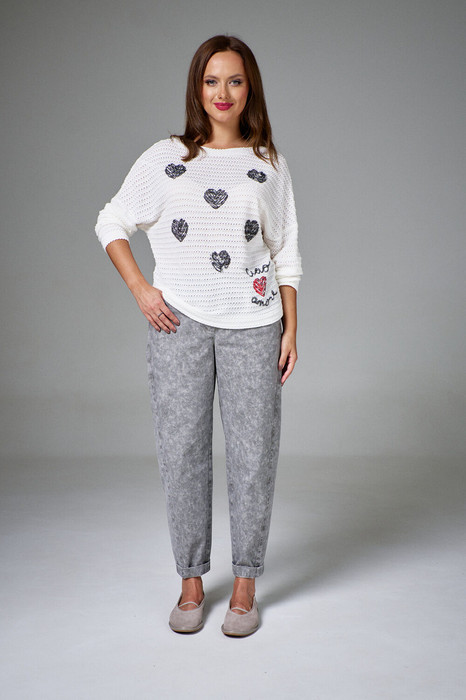 Джинсы из "мраморного" хлопка, с четырьмя функциональными карманами и поясом с резинкой на спинке. Боковые швы брюк переходят на перед. Изделие проходит энзимную стирку.