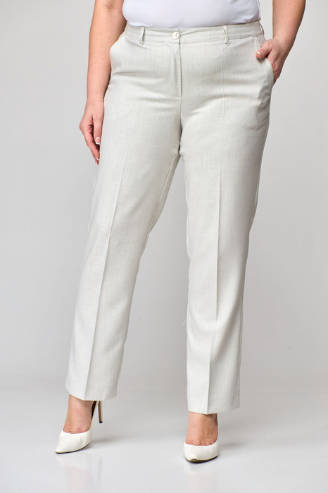 Классические брюки, прямые, слегка заужены к низу,заутюжены стрелки,по переду обработаны карманы с отрезным бочком,застежка на тесьму-молнию и 1 пуговицу.На задних половинках обработаны вытачки и имитация карманов с листочкой, пояс в брюках притачной. Длина брюк от талии по боковому шву 103 см.