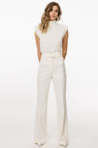 Брюки классические со стрелками, складками по переду, слегка зауженные к низу. По переду прорезные карманы с листочкой. Застежка на молнию и петлю с пуговицей. Пояс отрезной с вставкой эластичной тесьмы по спинке. Длина по боковому шву с учетом пояса - 98 см.