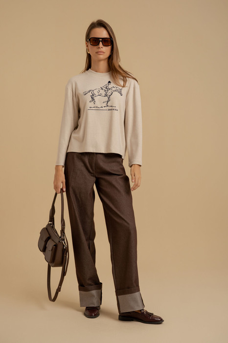 Брюки женские прямого силуэта из джинсовой ткани. Пояс - отрезной с застежкой на петлю с пуговицей. Имеются карманы. На передних половинках - классической формы для джинсов, на задних половинках - настрочные. Внизу - отвороты. Есть шлевки для ремня.
