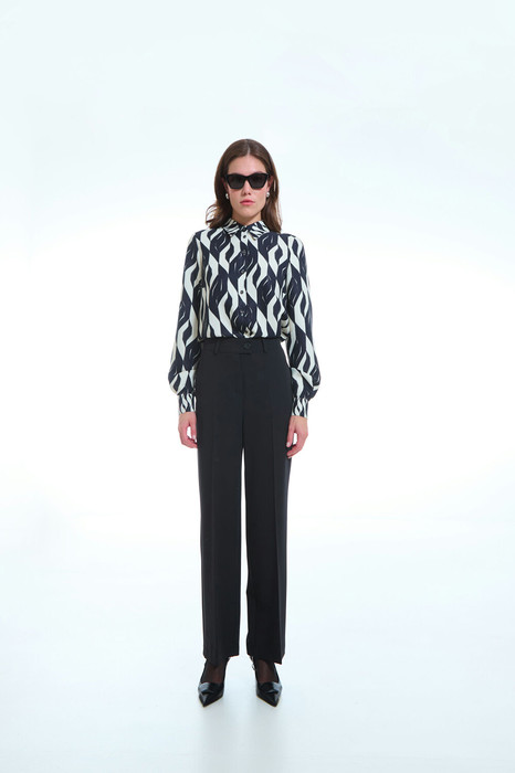 Брюки женские, зауженные к низу, со стрелками. По передним половинкам функциональные боковые карманы с листочкой, на задних половинках фиктивные карманы с листочкой. Застежка на молнию и пуговицу. В нижней части брюк по боковому разрез.