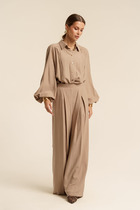 Брюки классические, слегка зауженные к низу. Пояс притачной, частично на резинке. Застежка спереди брюки на тесьму-молнию, петлю-пуговицу.