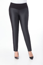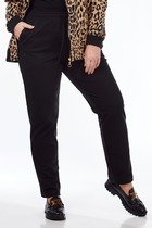 Брюки классические с заутюженными стрелками, слегка зауженные к низу, оформлены притачным поясом, частично на резинке. Застежка спереди брюк на молнию и петлю-пуговицу