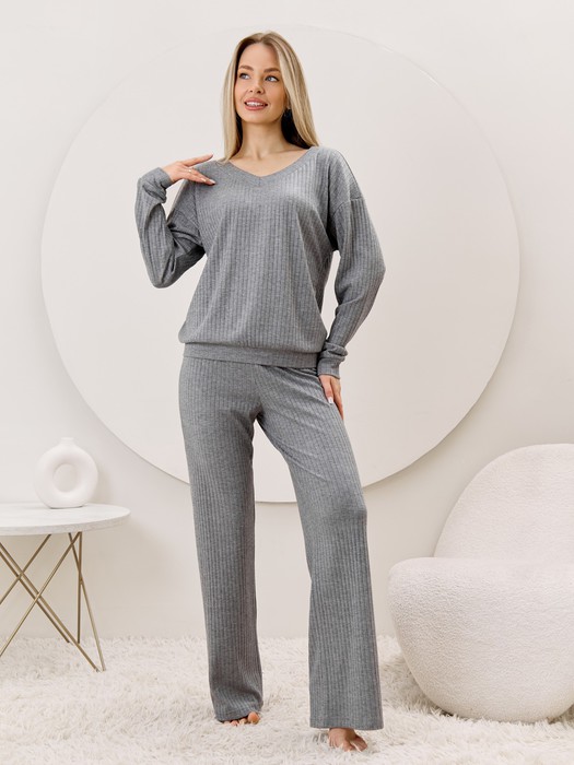 Брюки – женские из гладкокрашенного трикотажного фактурного полотна в «рубчик» с добавлением ангоры, полуприлегающего силуэта, длинные, слегка расширенные книзу, на притачном поясе с эластичной тесьмой внутри.