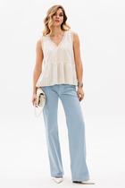 Брюки палаццо с притачным поясом из мягкой вельветовой ткани. Спереди застежка гульфик на молнии и петлей и пуговицей по поясу. По задней частям брюк вытачки. Пояс с резинкой в боковых частях. Брюки с заутюженными стрелками. Длина брюк с учетом пояса - 109 см.