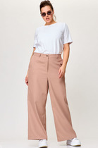 Брюки палаццо с притачным поясом из мягкой вельветовой ткани. Спереди застежка гульфик на молнии и петлей и пуговицей по поясу. По задней частям брюк вытачки. Пояс с резинкой в боковых частях. Брюки с заутюженными стрелками. Длина брюк с учетом пояса - 109 см.