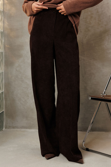 Брюки палаццо с притачным поясом из мягкой вельветовой ткани. Спереди застежка гульфик на молнии и петлей и пуговицей по поясу. По задней частям брюк вытачки. Пояс с резинкой в боковых частях. Брюки с заутюженными стрелками. Длина брюк с учетом пояса - 109 см.