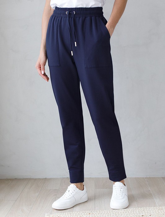 Состав: 95%Хлопок 5%ПУ Плотность: 240 Г/м2 Параметры модели на первом фото: Рост 172, бюст 88, талия 64, бедра 88Брюки выполнены из футера двухнитки с эластаном. Модель зауженная к низу дополнена карманами и эластичным поясом с фактурой в рубчик. В пояс вставлен плоский хлопковый шнур в тон изделия с золотистыми наконечниками. Изделие дополнено металлическим логотипом бренда. Сочетается в костюме с жакетом D49.078, джемпером D49.079, D49.080 и футболкой D49.081