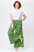 Брюки женские полуприлегающего силуэта, слегка зауженные к низу. По переду карманы с наклонным входом. Пояс притачной, по спинке пояса резинка, слева на шлевке расположен декор в виде металлического украшения. Застежка обработана на кнопку и молнию. Сзади расположены накладные карманы, на правом металлическое украшение. Брюки отстрочены отделочными строчками. По низу брюки асимметричны, перед короче. Манжета передней части на резинке.