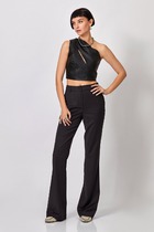 Прямые брюки на притачном поясе со шлевками. Застёжка спереди на молнию, обтяжную пуговицу и петлю. По переду изделия расположены функциональные боковые карманы.