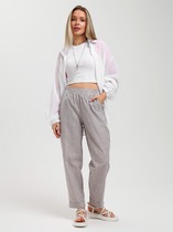 Брюки молодежные из тканого полотна с набивным рисунком в полоску, свободного покроя, с карманами в боковых швах, на притачном поясе с эластичной тесьмой внутри.