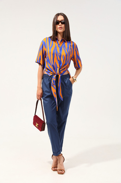 Удобные повседневные брюки из лёгкой ткани с вискозой в составе. Брюки свободного прилегания по бедрам и зауженные к низу. Пояс на эластичной тесьме с кулисой и втянутым шнурком. Вход в карман фигурный, наклонный к боковому шву.