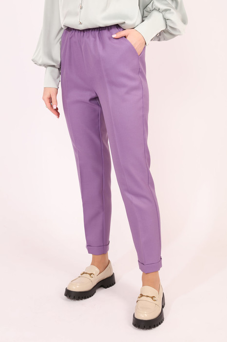 Брюки женские из тонкого костюмного полушерстяного полотна в цвете 2022 года по версии Pantone. Им стал сиреневый оттенок под названием 17-3938 Very Peri. В институте описывают новый цвет как «динамичный синий с живительным фиолетово-красным оттенком, который сочетает в себе верность и постоянство синего с энергией и возбуждением красного». Натуральное шерстяное волокно позволяют телу дышать, а полиэстер делает брюки более износостойким. Брюки свободного прилегания по бедрам и зауженные к низу, длинной 7/8. Пояс на эластичной тесьме с кулисой и втянутым шнурком. Вход в карман фигурный, наклонный к боковому шву. Длина брюк 95,5-97,5 см.