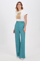 Брюки прямого силуэта с защипами из трикотажного полотна. По верху брюк притачной пояс и центральная застежка на петли и пуговицы. На передних половинках защипы и декоративные листочки. На задних половинках брюк накладные карманы. Обращаем ваше внимание, что фурнитура может отличаться от фото.