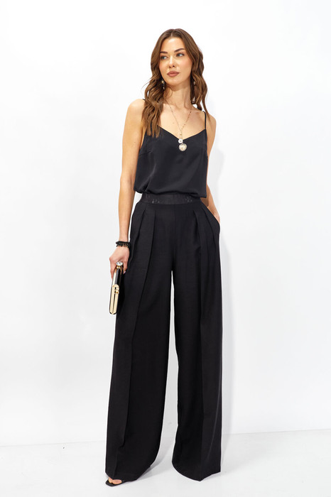Брюки прямого силуэта из струящейся ткани. По верху брюк притачная декоративная резинка. По переду обработаны карманы в боковых швах и декоративные складки. На задних половинках брюк листочки. Обращаем ваше внимание, что фурнитура может отличаться от фото.