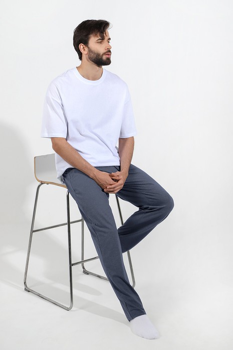 Брюки мужские из меланжированного трикотажного полотна "кулирка", прямого силуэта, с карманами в боковых швах, на притачном поясе с эластичной тесьмой внутри. В центре пояса - две обметанные петли , через которые продет шнурок для регулирования степени прилегания шорт по талии.