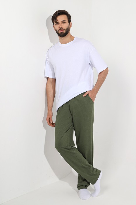 Брюки мужские из меланжированного трикотажного полотна "кулирка", прямого силуэта, с карманами в боковых швах, на притачном поясе с эластичной тесьмой внутри. В центре пояса - две обметанные петли , через которые продет шнурок для регулирования степени прилегания шорт по талии.