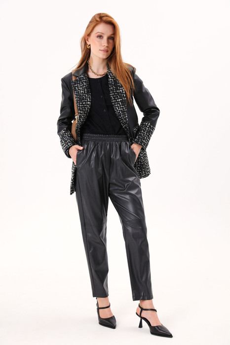 Брюки с притачным поясом, горизонтальным рассечением в области колена и с карманами в боковых швах.