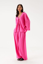 Прямые женские брюки с высокой посадкой, из льна. По верху брюк притачной пояс с застежкой на петли и пуговицы и шлевками для ремня. На передних половинках обработаны складки и карманы в боковых швах, застежка молния по переду. На задних половинках вытачки.