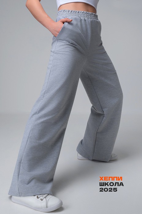Широкие брюки базового светло-серого цвета подойдут для физкультуры в школе, для прогулок и для посещения школьных секций. Плотные хлопковые штаны – прекрасный вариант на весну и осень. Брюки подойдут для образов на каждый день.