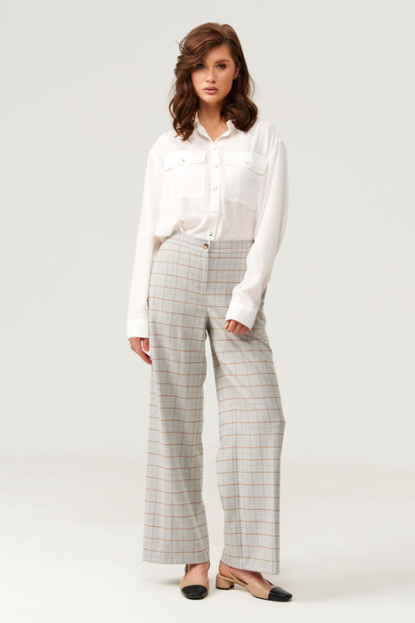 Брюки женские прямые из смесовой ткани в клетку для повседневной носки. Верхний срез брюк обработан притачным поясом, по задней части брюк присутствует пояс с вставкой на резинке. Застежка на одну петлю и одну пуговицу, а также имеется застежка на тесьму-молнию в среднем шве брюк. В брюках расположен в боковом шве карман с подкройным бочком. Отличный классический вариант брюк, которые будут гармонично смотреться под любые изделия.