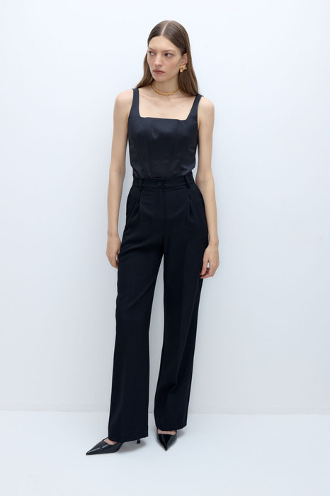 Текстильные брюки-палаццо с высокой посадкой. Детали: высокая посадка, широкие и длинные брюки, притачной пояс со шлевками, передние половины с небольшими застроченными мягкими складками и заутюженными стрелками, застежка на молнию и пуговицу, боковые карманы