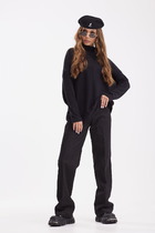 Прямые брюки из экокожи. Детали: брюки с высокой посадкой, прилегающий силуэт, притачной пояс со шлевками, застежка на молнию и пуговицу, перед с боковыми карманами, спинка с кокеткой и двумя накладными карманами, разрезы по низу боковых швов. Изнанка экокожи с небольшим ворсом.