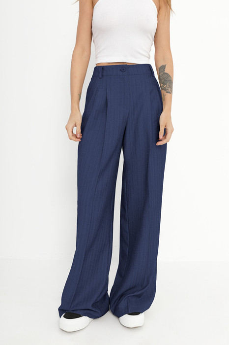 Детали: притачной пояс со шлевками, складки, застежка на молнию и пуговицу, боковые карманы. Задние части брюк с вытачками и имитацией карманов.