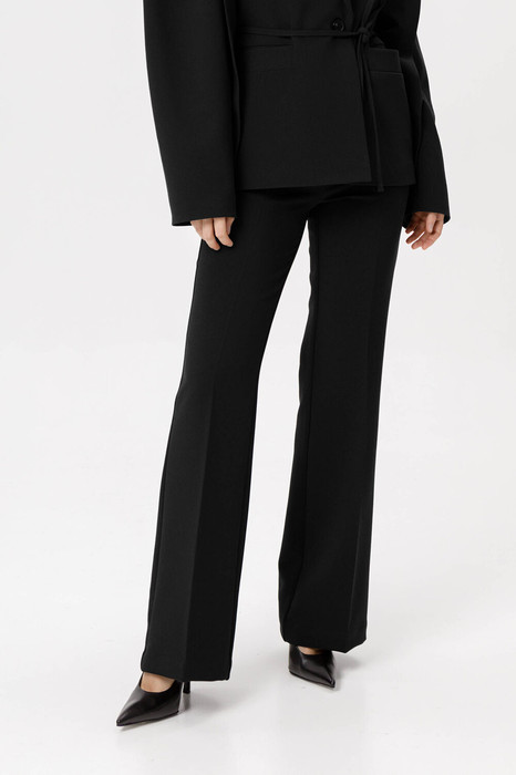 Детали: притачной пояс со шлевками, передние половины с заутюженными стрелками, застежка на молнию и потайные крючки, боковые карманы. Задние части брюк с вытачками и заутюженными стрелками. Пояс брюк без резинки.