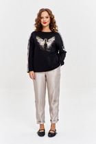 Детали: брюки с притачным поясом со шлевками, складки у пояса, застежка на молнию и пуговицу, боковые карманы, заутюженные стрелки. Задние части брюк с вытачками и имитацией карманов.