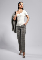 Детали: притачной пояс со шлевками, передние половины с заутюженными стрелками, застежка на молнию и потайные крючки, боковые карманы. Задние части брюк с вытачками и заутюженными стрелками. Пояс брюк без резинки.