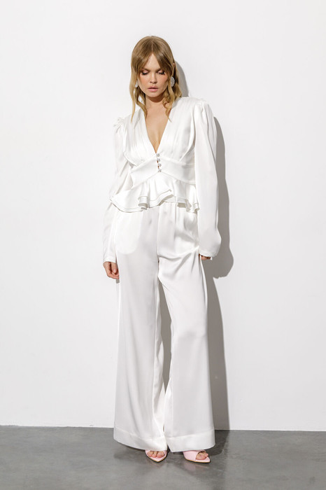 Атласные широкие брюки на резинке (приобрести блузу с фото можно по арт. 6704).