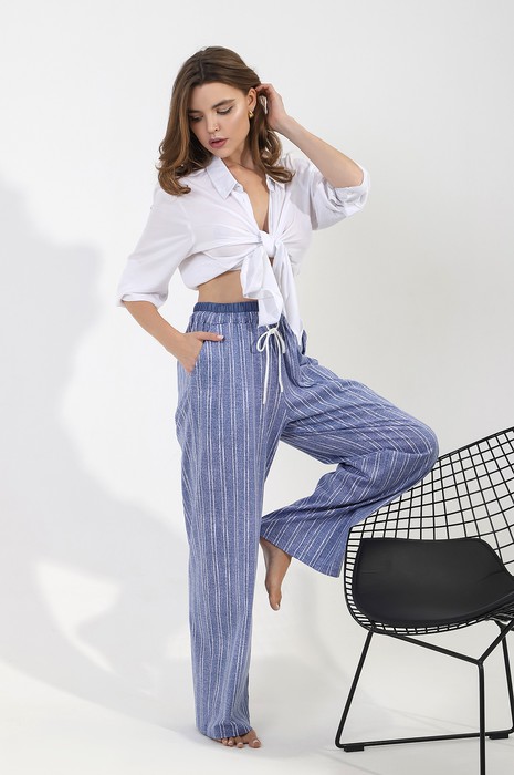 Брюки - молодежные из трикотажного полотна «кулирка» с набивным рисунком «полоска», длинные, свободные, на притачном поясе с эластичной тесьмой внутри, выполненным из двух видов ткани: с набивным рисунком и гладкокрашеной. В пояс вставлен декоративный шнурок, продетый через две обметанные петли в центре пояса.