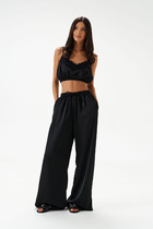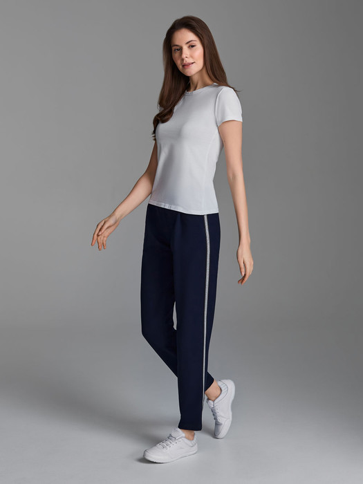 Брюки женские из хлопкового трикотаж в стиле "каррот" с небольшими складками по линии талии. Карманы брюк прорезные, с боковыми вставками. Вдоль боковых швов брюк нашита декоративная трикотажная лента с серебристой нитью. Низ брюк заужен. Пояс брюк настрочен на эластичную резинку, дополнительно регулируется шнуром.
