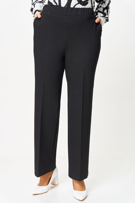 Брюки женские из эластичного трикотажного полотна, прямого от бедра кроя. По передним половинкам брюк расположены фигурные карманы. По передним и задним половинкам заутюжнены канты. Пояс брюк притачной, с эластичной тесьмой-резинкой.