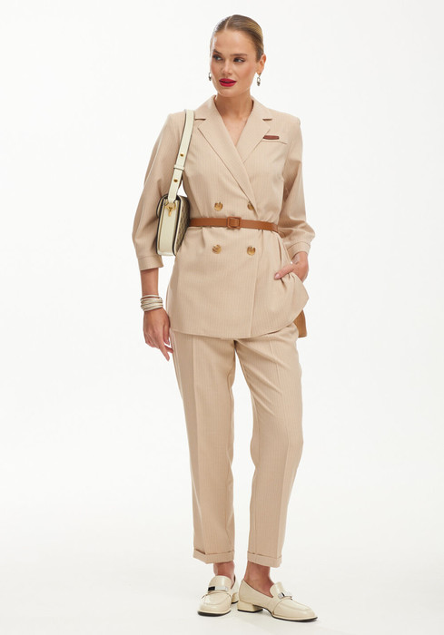 Брюки в полоску легко сочетать и носить практически с любой одеждой из базового гардероба. Например, очень стильно будут смотреться эти брюки, вписанные в деловой образ. Лучше сразу подобрать к ним подходящий верх – это может быть пиджак или модный жакет. Такой лук подойдет для офиса или учебы, так как выглядит очень формально и сдержано.