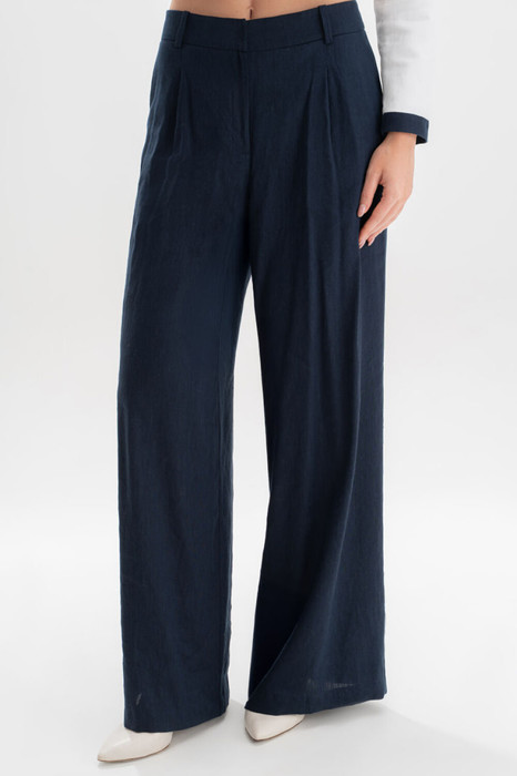 Стильные брюки из лёгкого натурального льна — идеальный выбор для тёплого сезона. Свободный прямой крой обеспечивает комфорт на каждый день, а аккуратные складки спереди придают образу утончённости. Тёмно-синий цвет легко сочетается с базовыми и яркими элементами гардероба.