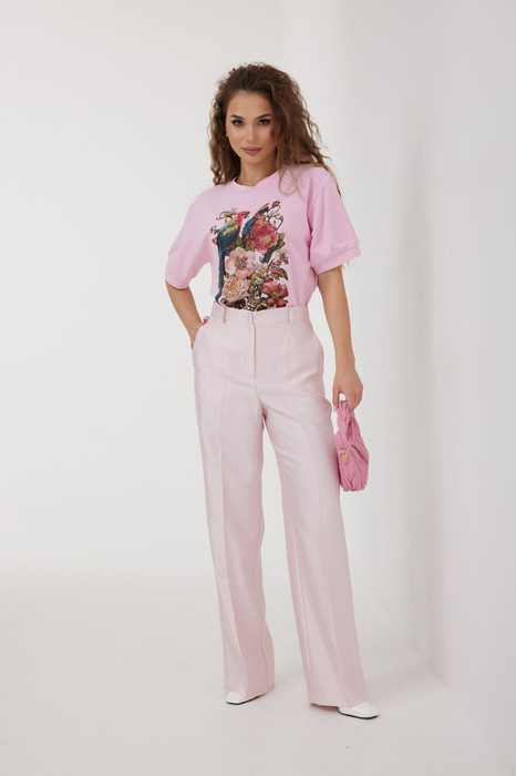 Средняя посадка, пояс притачной, застежка спереди на молнию и пуговицу. По переду боковые карманы.