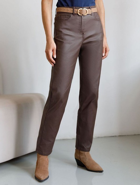 Удобная посадка подчеркивает фигуру, а свободный крой создает эффектную форму \"мом\". Особый шов сзади без отстрочки добавляет лаконичность дизайну. Брюки не сковывают движений и приятны к телу. Универсальная коричневая расцветка легко комбинируется с любым верхом – от объемных свитеров до облегающих топов. Идеальный вариант для создания как повседневных, так и более нарядных луков с ноткой дерзости. Практичный материал не мнется и устойчив к износу, делая эти брюки must-have в вашем гардеробе.