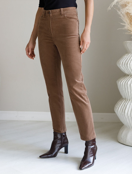 Брюки выполнены из мягкого хлопкового микро-вельвета с добавлением эластана. Изделие комфортно садится по фигуре и не сковывает движения. Модель с пятью карманами, как у джинсов-скинни дополнена высококачественной фурнитурой с фирменным логотипом бренда. Хорошо комбинируется с вязаным трикотажем, блузками и денимом. Как альтернатива брюкам, в нестрогий офисный дресс-код.