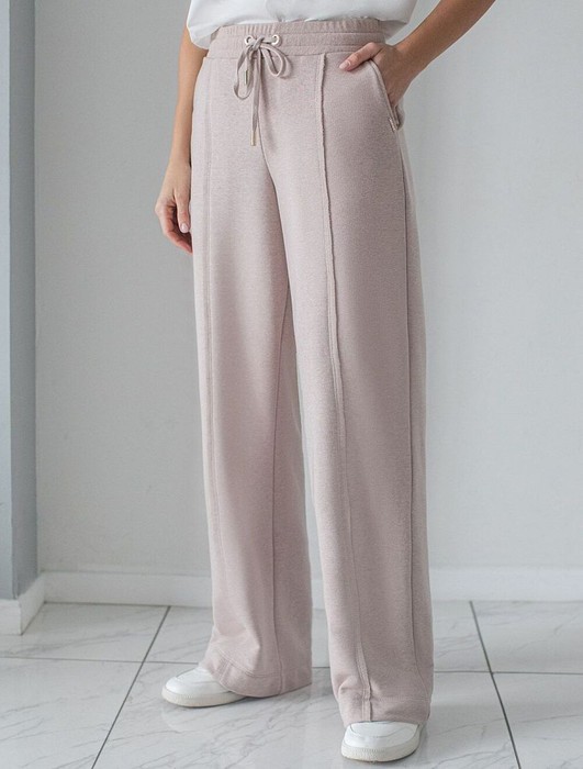 Брюки прямого кроя с удобным эластичным поясом на резинке и карманами по бокам выполнены из премиального футера-двухнитки. Наличие эластана в составе гарантирует комфорт и долговечность изделия, материал хорошо пропускает воздух, позволяя телу дышать.. Эти уютные брюки нежного цвета макиато с эффектом меланж созданы для вашего комфорта. Свободный прямой крой обеспечивает свободу движений и максимальное удобство в любых ситуациях, поэтому они подойдут и на большие размеры, а так же на высокий или низкий рост. Фигура подчеркивается, а силуэт визуально вытягивается за счет кроя палаццо и застроченных декоративных стрелок. Вы можете создать стильный образ на каждый день в сочетании с джемпером D49.139 и бомбером D49.141. В повседневных трикотажных брюках вы будете чувствовать себя комфортно и уверенно, наслаждаясь каждым моментом дня.